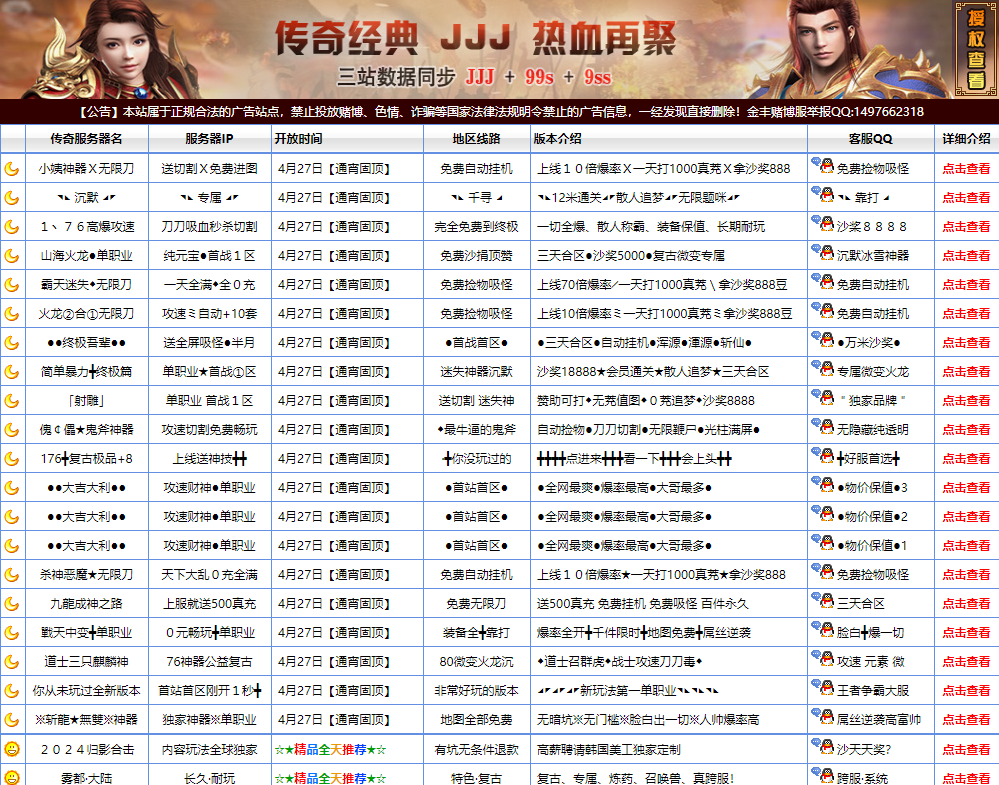 JJJ网又名,3000ok、99s、9ss,进二十年的老牌一线传奇私服发布站,无论是人气和广告量都是行业中的佼佼者!