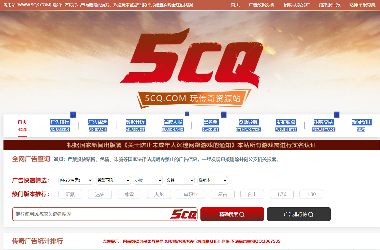 5CQ.Com传奇广告排行榜,传奇私服查询站,传奇资源站,好玩的传奇排名站,玩家最爱的新开传奇,GM最喜欢的传奇工具,传奇直播,传奇新开服,传奇相关尽在5CQ(玩传奇)
