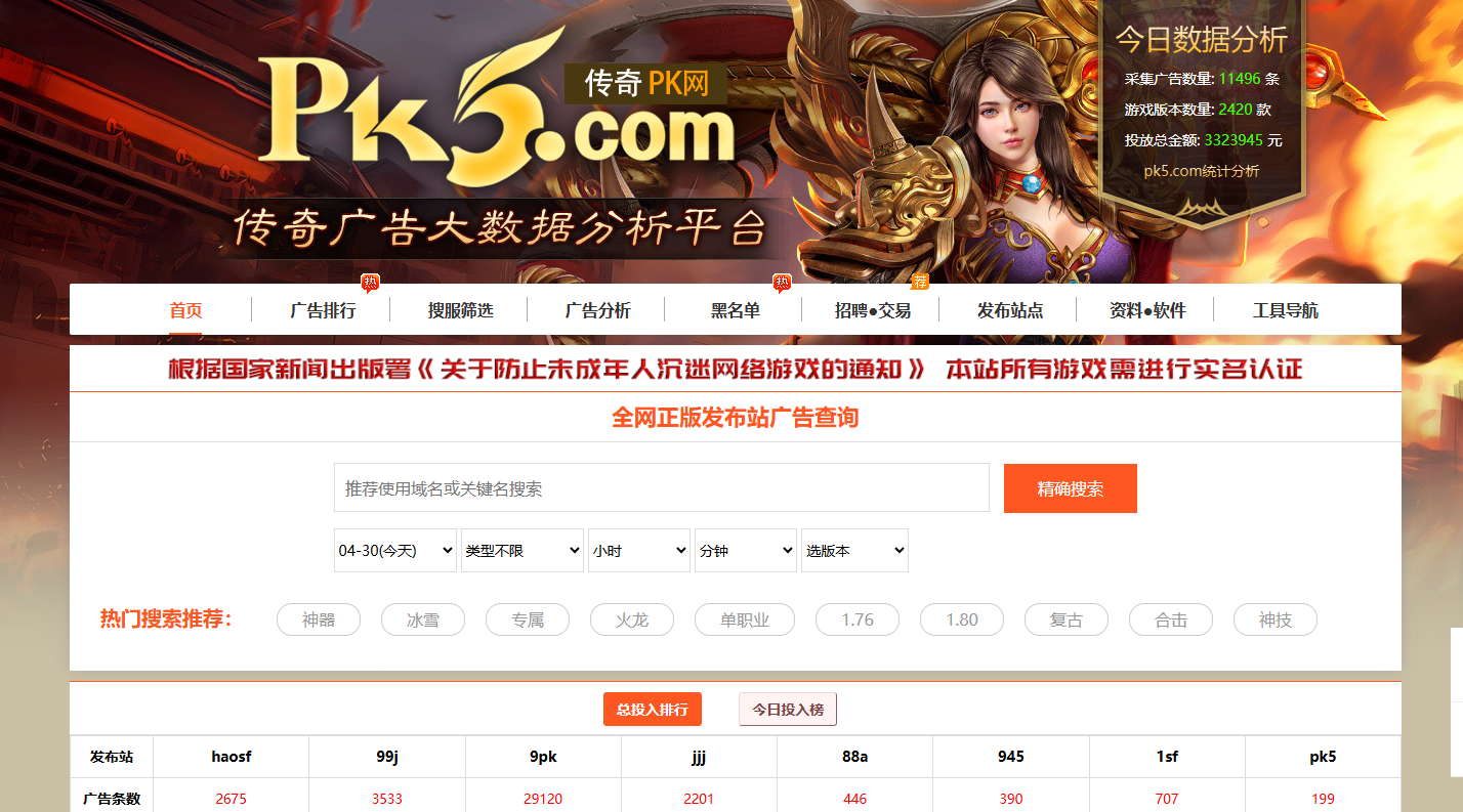 自主研发传奇私服在线查询传奇SF广告功能,可查询实时传奇广告发布数据,也可查询各发布站实时数据分析,还可查看各站点价格与链接。
